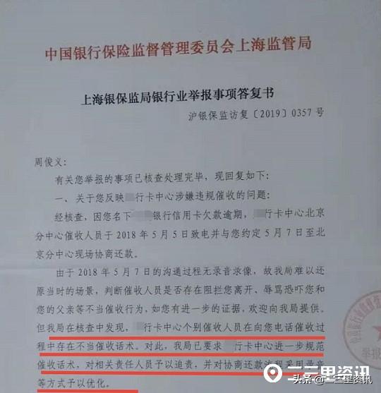 2019年2月上海银保监局出具的银止业告发事项回答书显现,经核对,周教师名下信誉卡短款过期,该止信誉卡中心北京分中心催支职员于2018年5月5日致电并取周教师商定5月7日至北京分中心现场协商借款。因为5月7日的相同历程无灌音录相,故银保监局易以复原其时的场景,判定催支职员能否存正在拦阻周教师离开、唾骂恫吓周教师女子等不妥催支举措。