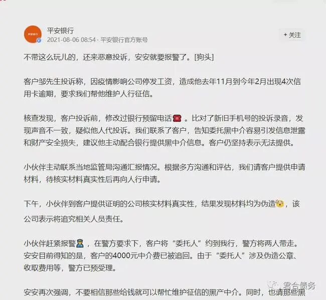 客户信用卡逾期后,竟找黑中介恶意投诉银行。已被安全银行报警,并且抓捕归案。