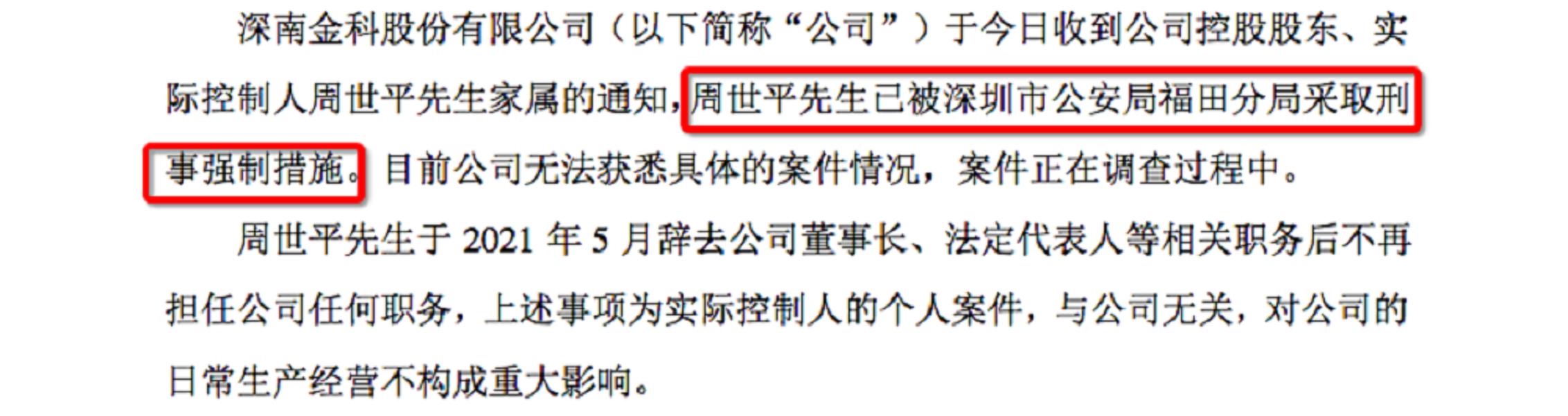 7月22日晚间,A股上市公司深南股份公告称,公司现实控制人周世平已被深圳市公安局福田分局采取刑事强制步伐。